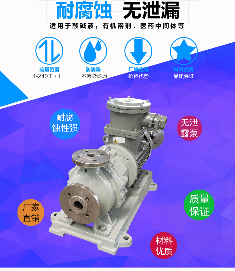 WJC不銹鋼磁力泵過流部件采用全不銹鋼材料(304、316、316L),內(nèi)、外磁轉(zhuǎn)子選用高磁能積、高矯頑力的稀土永磁制造,具有高效節(jié)能、介質(zhì)適用面廣、耐高溫、磁性強、不退磁等優(yōu)點,對有機酸,有機化合物,堿,中性溶液和各種氣體都有良好的耐蝕性,雙螺旋糟碳石墨軸承和硬質(zhì)合金軸套,具有較強的耐磨性,是應用磁力耦合實現(xiàn)無接觸傳動、無動密封的新型高品質(zhì)磁力化工泵。保證了產(chǎn)品的壽命,是無泄漏輸送腐蝕性介質(zhì)的理想用泵。