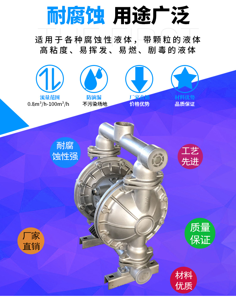 采用壓縮空氣為動力源,對于各種腐蝕性液體,帶顆粒的液體,高粘度、易揮發、易燃、劇毒的液體,均能予以抽光吸盡,尤以適合易燃易爆場。