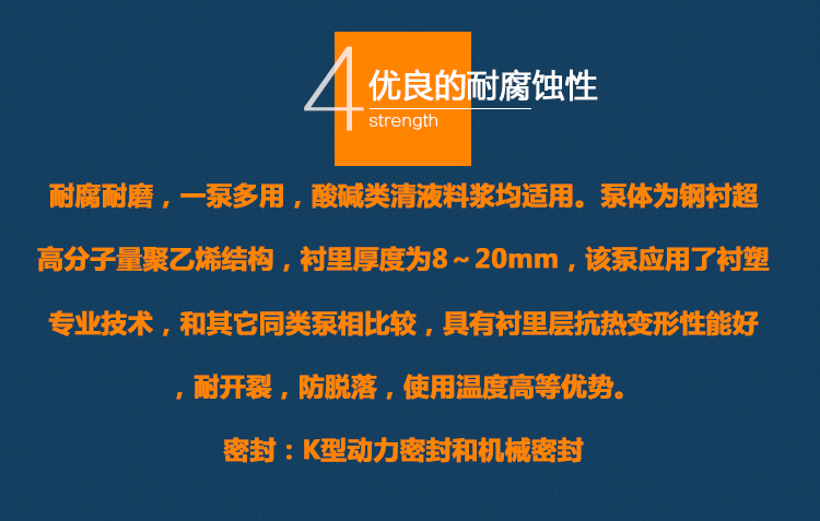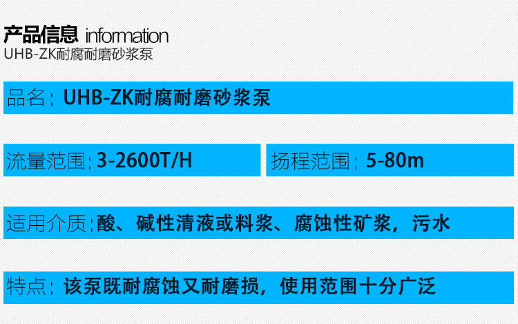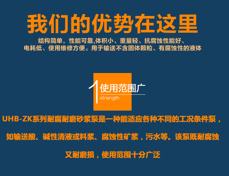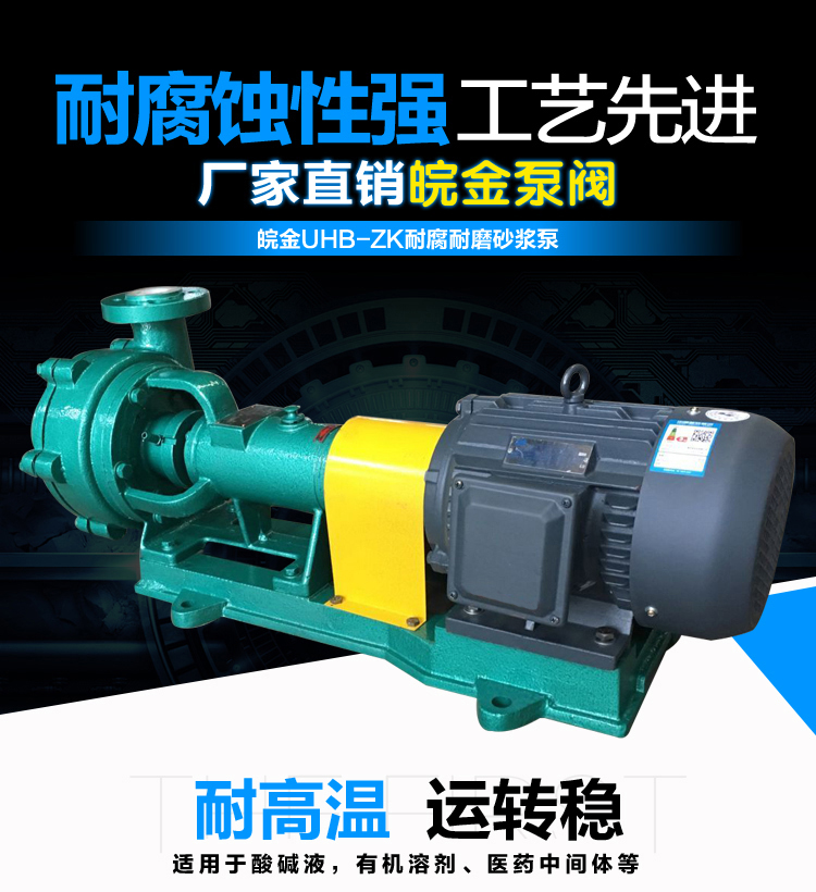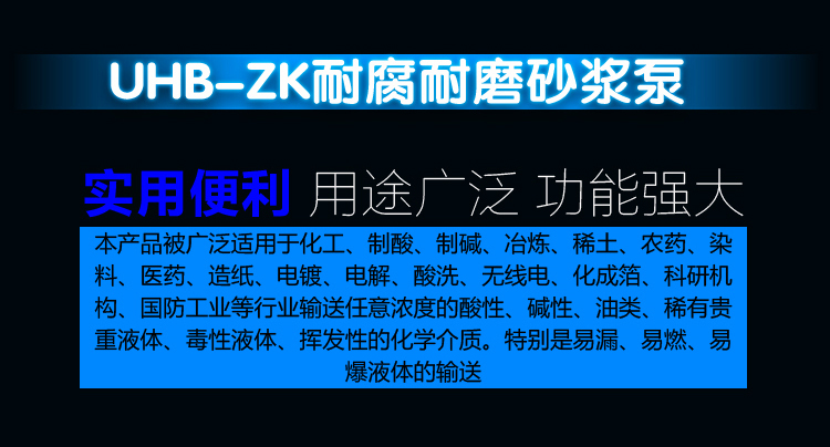 UHB-ZK耐腐耐磨砂漿泵能適應各種不同的工況。如:既可以傳送酸、堿類清液或料漿,也可以輸送冶煉行業各種腐蝕性礦漿,還可以輸送硫酸行業各類稀酸、環保行業的各類污水等??奢斔蜐舛?0%以下的硫酸、50%以下的硝酸、鹽酸等積各類酸、堿、鹽的料漿,稀有金屬冶煉行業的各種腐蝕性砂漿及食品,酒類行業中的各類混合型介質。該泵既耐腐蝕又耐磨損,使用范圍十分廣泛。